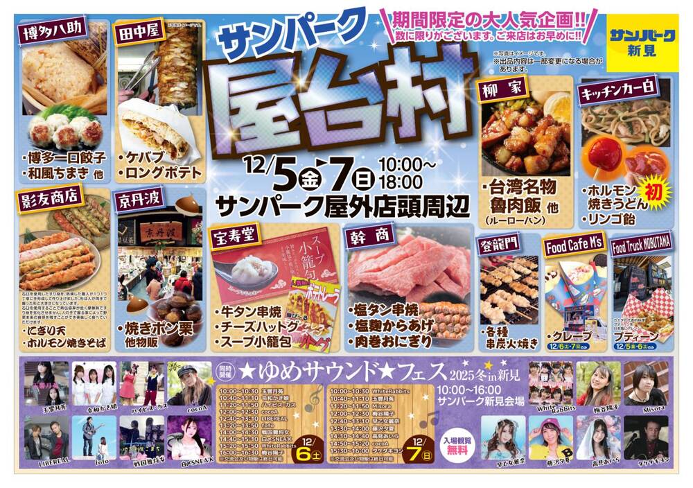 ゆめサウンドフェス LIVE SCHEDULE 2025/12/06(土) - 2025/12/07(日) サンパーク新見 12/6 START 10:00/END 16:00 12/7 START 10:00/END 16:30 入場・観覧無料 12/6 出演時間/12:00~ 12/7 出演時間/14:50~ URLをコピーする 報告する