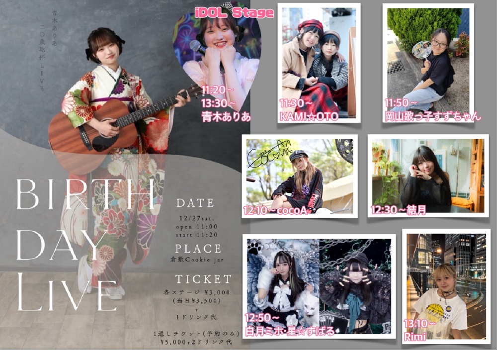 青木ありあ生誕祭 LIVE SCHEDULE 2025/12/27(土) 倉敷Cookie jar OPEN 11:00/START 11:20 予約3000円/当日3500円+ワンドリンク 通し予約5000円+2ドリンク cocoA予約の方はDMまでご連絡お願いします✧︎ 予約はこちらから URLをコピーする 報告する