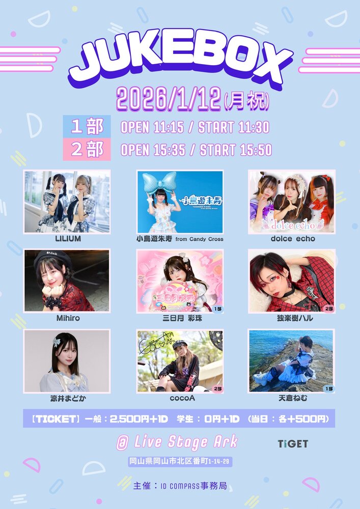 JUKE BOX LIVE SCHEDULE 2026/01/12(月) Live Stage Ark 地図を表示 2部 OPEN 15:35/START 15:50 一般 2500円/学生 無料/当日 3000円 +1D cocoA予約の方はDMまでご連絡お願いします✧︎ チケットはこちらから URLをコピーする 報告する