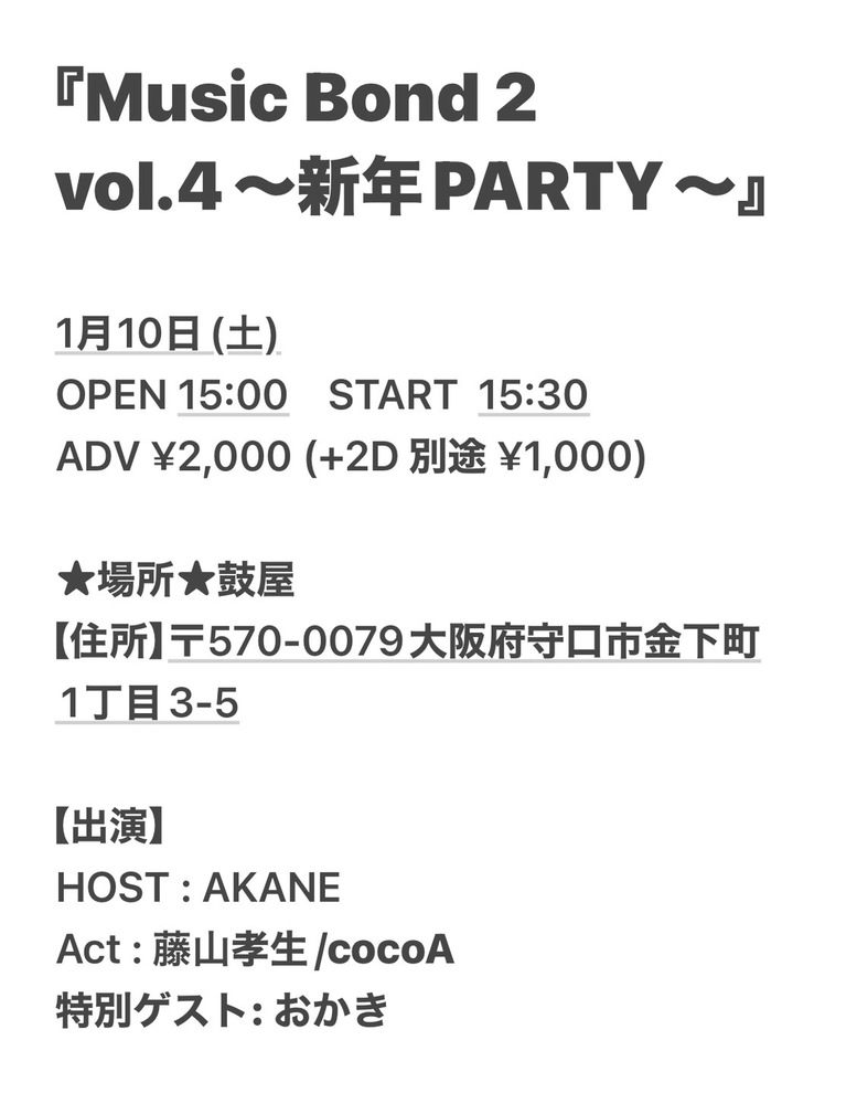 Music Bond2 vol.4〜新年PARTY〜 LIVE SCHEDULE 2026/01/10(土) 鼓屋 OPEN 15:00/START 15:30 出演時間/15:50〜 一般 2000円+2D cocoA予約の方はDMまでご連絡お願いします✧︎ URLをコピーする 報告する