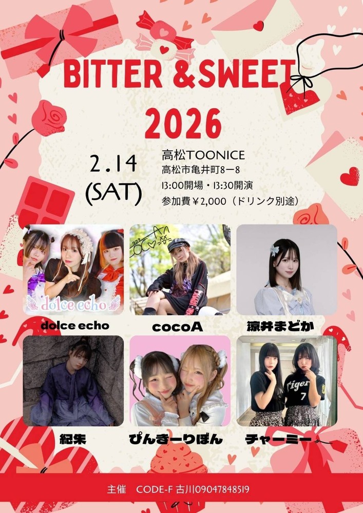 BITTER&SWEET LIVE SCHEDULE 2026/02/14(土) TOONICE 地図を表示 OPEN 13:00/START 13:30 出演時間/16:10~ 一般2000円+1D cocoA予約の方はインフォ垢DMまでご連絡お願いします♩ URLをコピーする 報告する