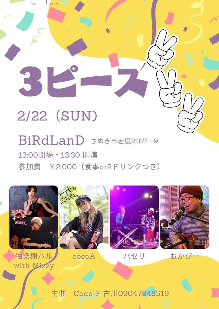 3ピース LIVE SCHEDULE 2026/02/22(日) BiRdLanD OPEN 13:00/START 13:30 出演時間/13:30~ 一般2000円(食事or2ドリンク付き) cocoA予約の方はインフォ垢DMまでご連絡お願いします♩ URLをコピーする 報告する